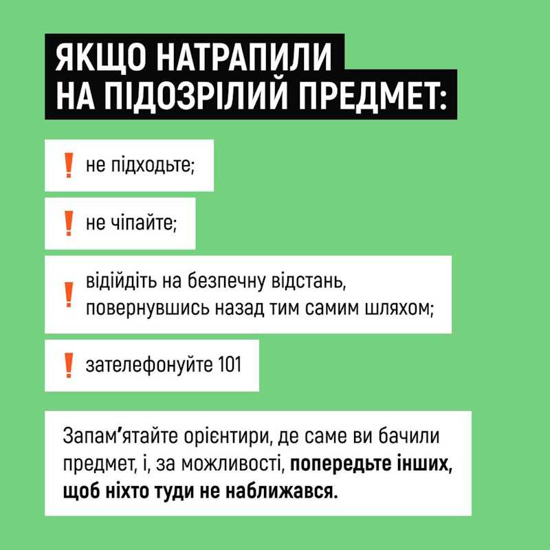 Ключове правило, що рятує життя: помітив не наближайся повертайся тим самим шляхом, яким прийшов викликай 101.