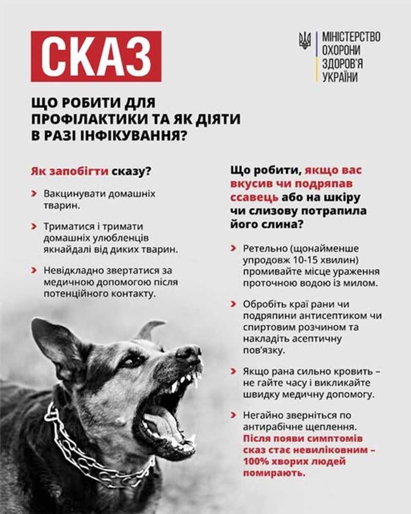 Без вчасно розпочатої терапії сказ зумовлює незворотні наслідки для центральної нервової системи, зрештою – людина помирає… Саме тому фахівці ЦПМСД №1 радять не легковажити і невідкладно (ще до появи симптомів) звертатися по медичну допомогу, якщо мали місце:
